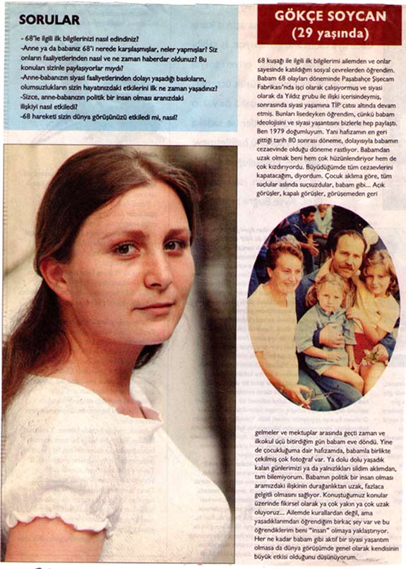 Çocukluğumdan beri aile içinde, hatta misafirler geldiğinde bile her zaman konuşulan şey siyasettir; geçmiş, gelecek, Türkiye gündemi… 68’le ilgili bilgilerimi böyle edindim. Ancak bunlar daha çok siyasi bilgilerdi, çünkü babam anılarını anlatmayı pek sevmez. 68’de TİP’in Tarsus ilçe başkanlığını yaptığını, daha sonrasında da Ankara’da siyasi faaliyetlerde bulunduğunu biliyorum. 12 Mart ve 12 Eylül’de kaçakmış, o nedenle annemle evlenememişler, annem bana hamile kalınca Anadolu’nun bir köyünde gizlice nikâh kıydırmışlar. Ben doğduktan sonra da babamın kaçaklığı devam etmiş, annem de 80’de devlet memuruyken Ankara’dan Yozgat’a sürgün edilmiş. Ancak ben 85 doğumluyum, bir şeyleri idrak edebilecek yaşa geldiğimde pek çok şey durulmuş, değişmişti. O yüzden bende kötü iz bırakacak bir etkisi olmadı. Sadece ufak sorunlar yaşadım. Mesela liseyi, Halkalı’da okudum, orada Ülkü Ocakları güçlüydü. Sınıfımda Ülkü Ocakları’na gidip gelen sekiz-dokuz çocuk vardı ve ismimden dolayı ailemin görüşü direkt anlaşıldığından, komünist diye beni sürekli rahatsız ettiler... Çok saçma sorunlar yaşadım, tartıştım, kavga ettim, birçok arkadaşım bana boşver, yanıt verme derken ben ismime sahip çıktım ve bu mücadele bilincini ailemden aldım. Politikanın hayatın ta kendisi olduğunu, insanın apolitik ya da asosyal olamayacağını, her zaman bir dünya görüşü olması gerektiğini anlamamı onlar sağladı. Ailem hâlâ politikanın içinde. Beni de hiçbir zaman eylemlerden uzak tutmadılar. İnsanın savunduğu şey, verdiği mücadele kişiliğine oturuyor, ister istemez bunlar aile içine de, ilişki biçimine de yansıyor. Bizde ilişkiler klasik aile tiplemesinden biraz daha farklıdır ve bu bana verilmiş bir nimet bence, çünkü benim tek başıma ayakta durmama önayak oldular.